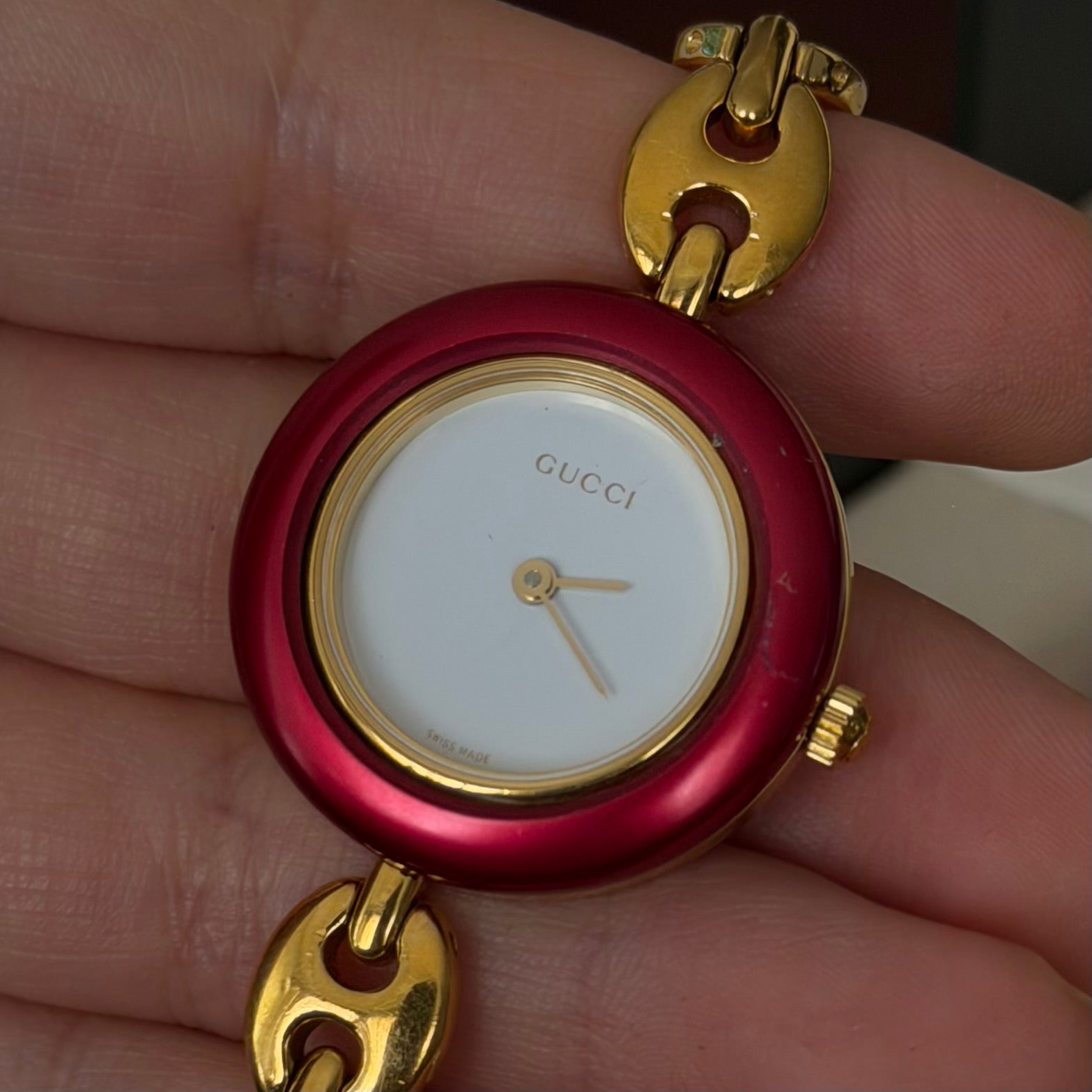 Gucci gold mariner link style watch with white dial and changeable bezels
