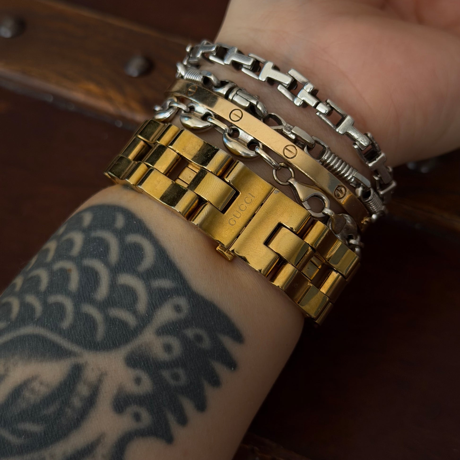 Gucci gold plated square white dial watch with unique chunky chain style bracelet